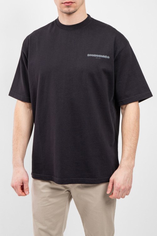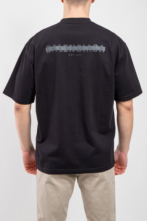 Мужская черная хлопковая футболка от Balenciaga (Баленсиага). Логотип на груди и на спине, круглый вырез горловины, короткий рукав, классическая длина.