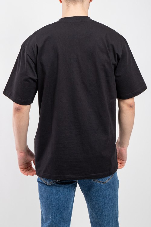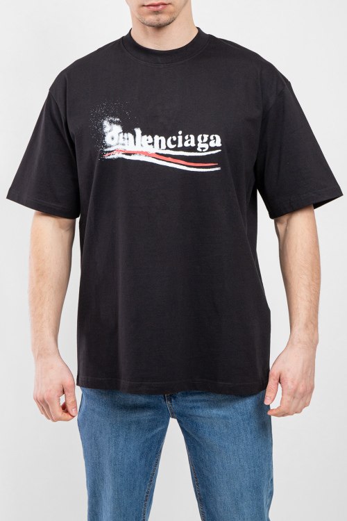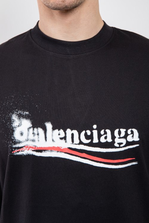 Мужская черная футболка из хлопка от Balenciaga (Баленсиага). Классическая длина, круглый вырез горловины, короткие рукава, брендированный принт на груди.