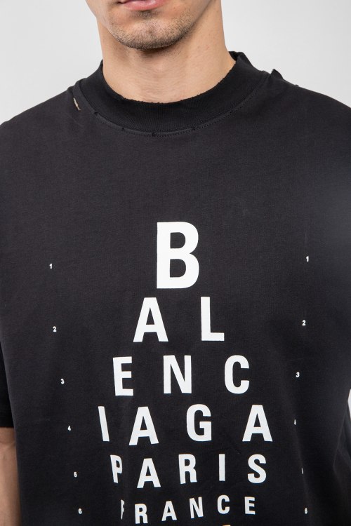 Мужская черная хлопковая футболка Optical от Balenciaga (Баленсиага). Принт с логотипом, дизайн с рваными деталями, круглый вырез горловины, короткий рукав, удлиненная длина.