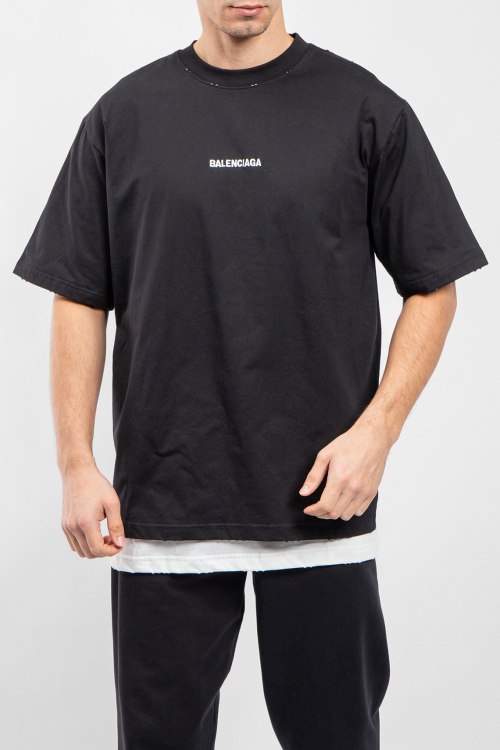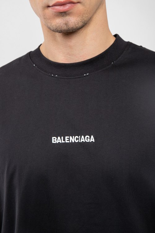 Мужская черная хлопковая футболка от Balenciaga (Баленсиага). Модель oversize, логотип на груди и на спине, нижний край с белой вставкой, круглый вырез горловины, короткий рукав, удлиненная длина.