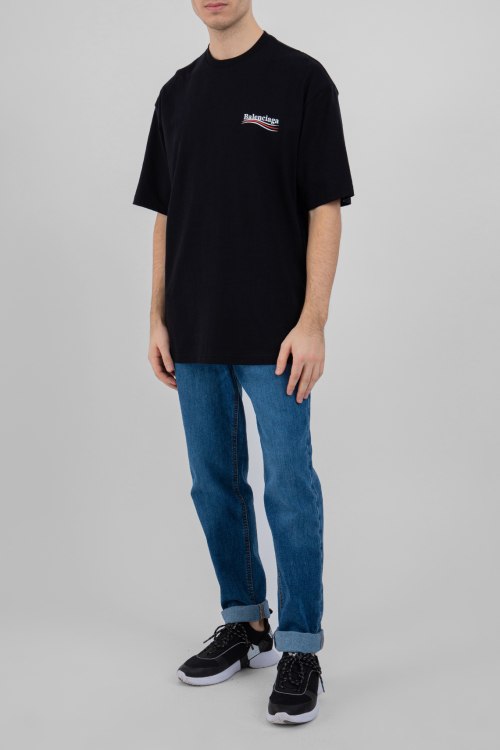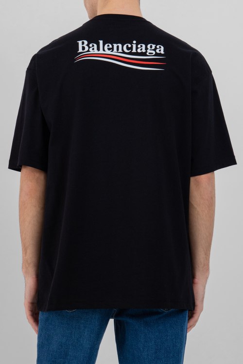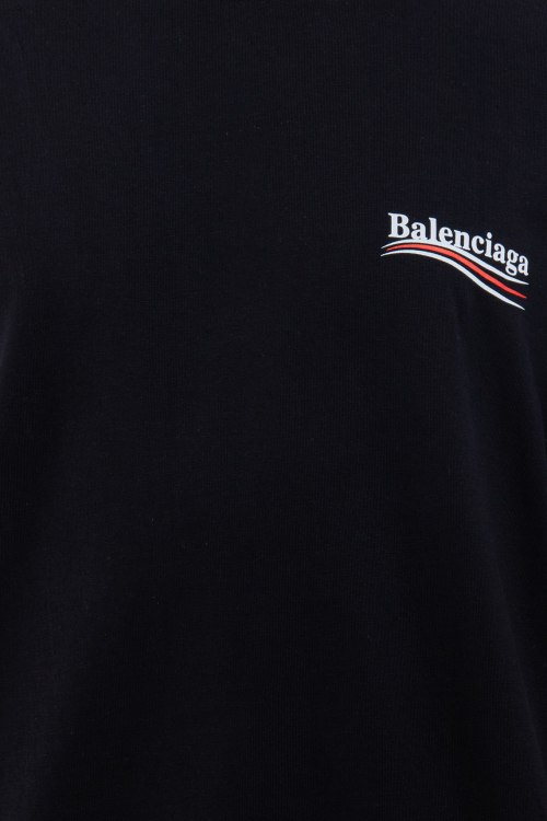 Детали: Мужская черная хлопковая футболка от Balenciaga (Баленсиага). Двухсторонний принт с логотипом, круглый вырез горловины, короткий рукав