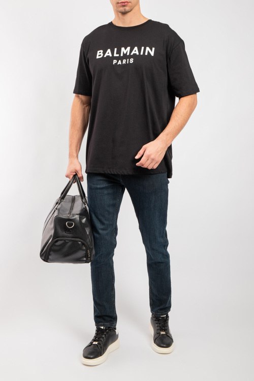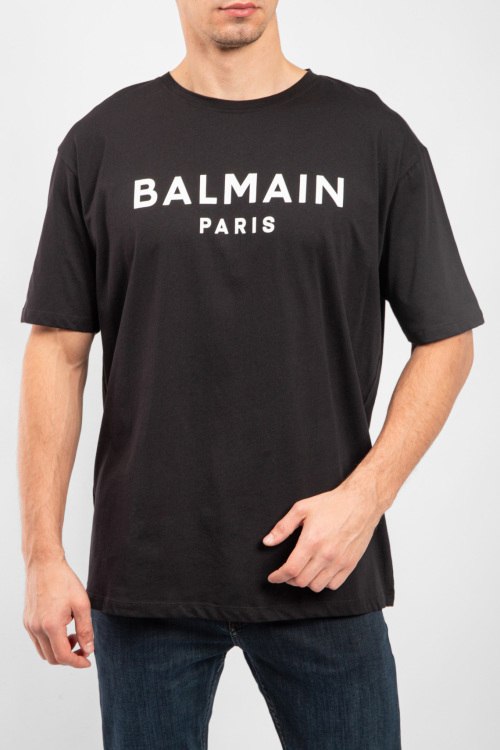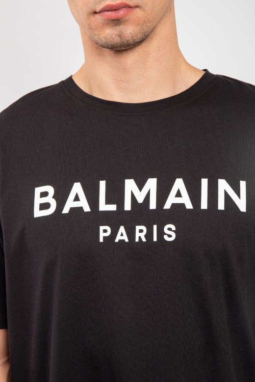 Мужская черная хлопковая футболка от Balmain (Бальман). Принт с логотипом на груди, круглый вырез горловины, короткий рукав, классическая длина.