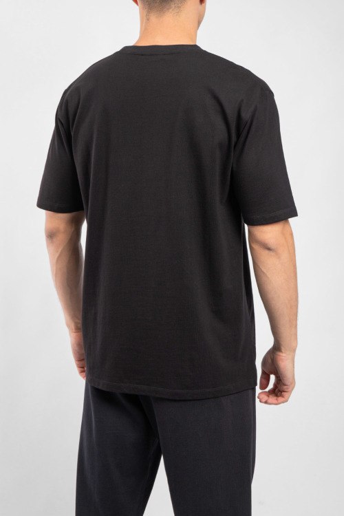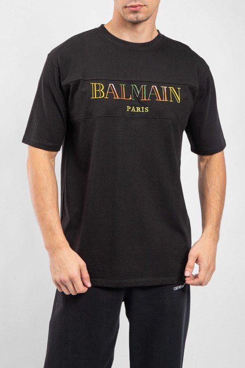 Мужская черная хлопковая футболка от Balmain (Бальман). Вышитый логотип на груди, круглый вырез горловины, короткий рукав, удлиненная длина.