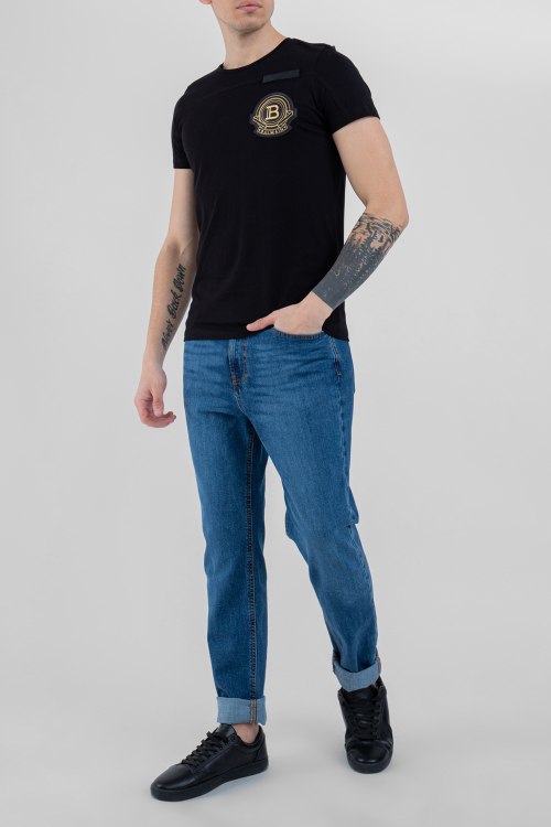 Мужская черная футболка из хлопка от Balmain (Бальман). Классическая длина, короткие рукава, круглый вырез горловины, ровный низ изделия, декор: нашивка с логотипом бренда.