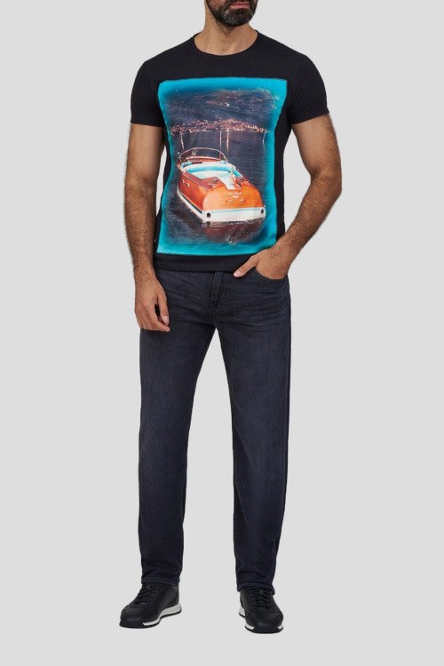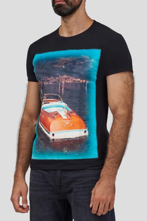 Детали: Мужская черная хлопковая футболка с принтом Azul Boat от Bastille (Бастилл). Принт спереди, круглый вырез горловины, короткий рукав, классическая длина
