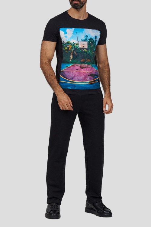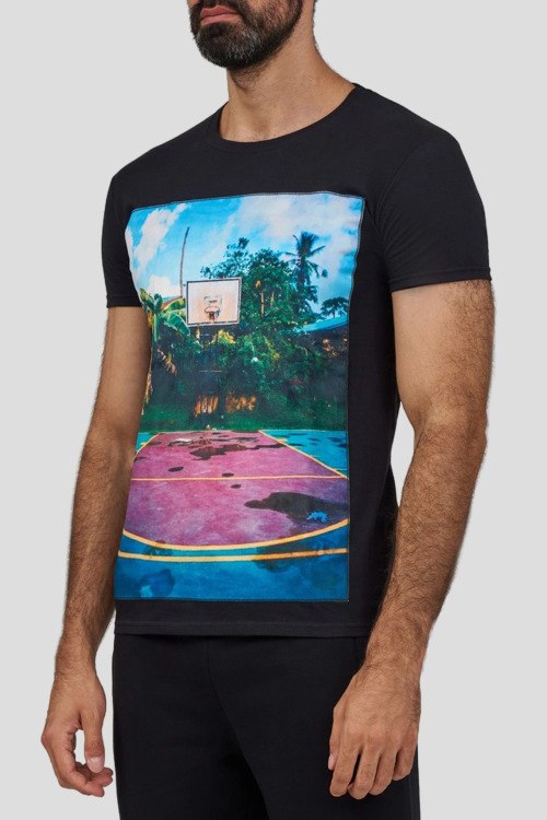 Детали: Мужская черная хлопковая футболка с принтом Palawan от Bastille (Бастилл). Принт спереди, круглый вырез горловины, короткий рукав, классическая длина