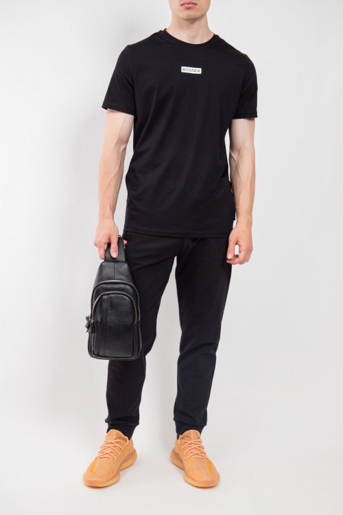 Детали: Мужская черная хлопковая футболка Roc от Bogner (Богнер). Принт с логотипом на груди, круглый вырез горловины, короткий рукав, классическая длина