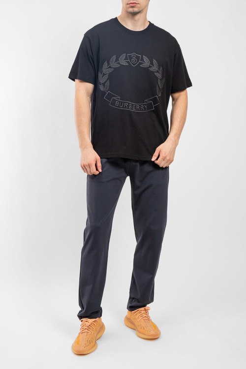Мужская черная хлопковая футболка от Burberry (Бёрберри). Вышитый логотип на груди и на спине, круглый вырез горловины, короткий рукав, удлиненная длина.
