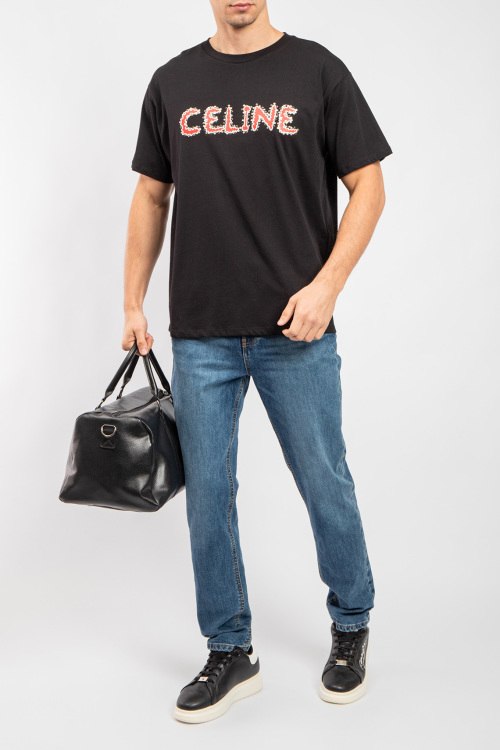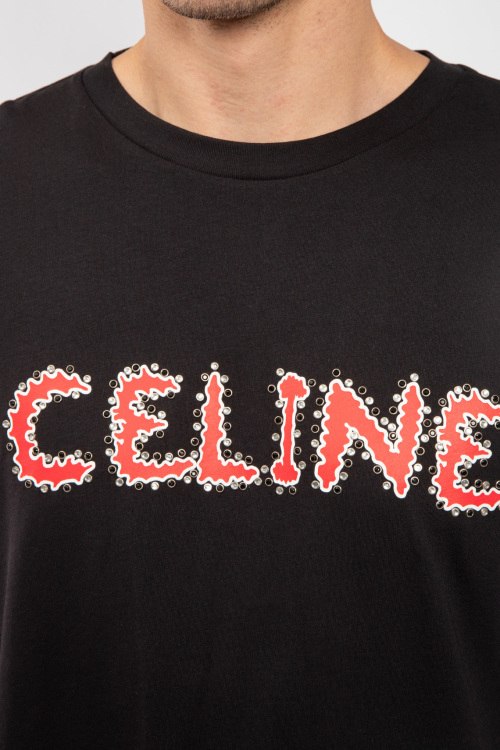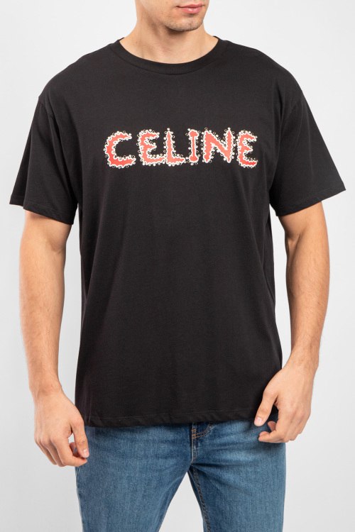 Мужская черная хлопковая футболка от Celine (Селин). Логотип на груди, круглый вырез горловины, короткий рукав, классическая длина.