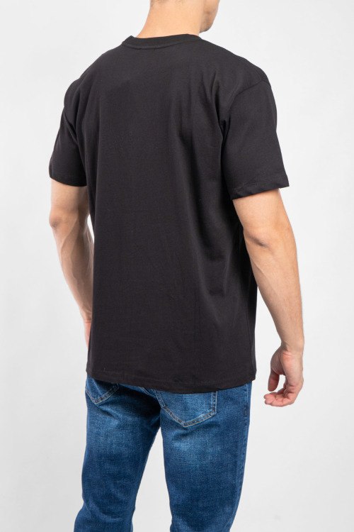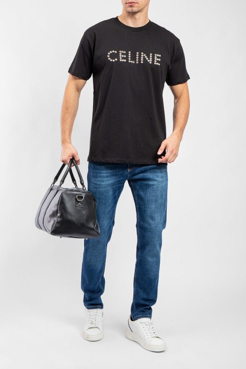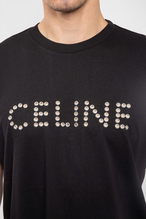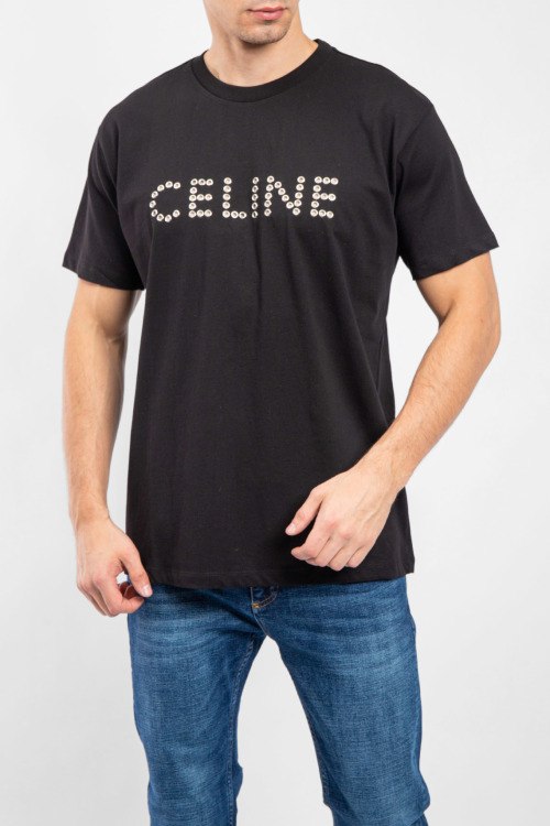 Мужская черная хлопковая футболка от Celine (Селин). Логотип на груди из заклепок, круглый вырез горловины, короткий рукав, удлиненная длина.