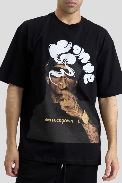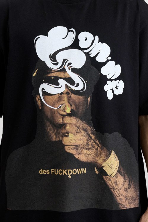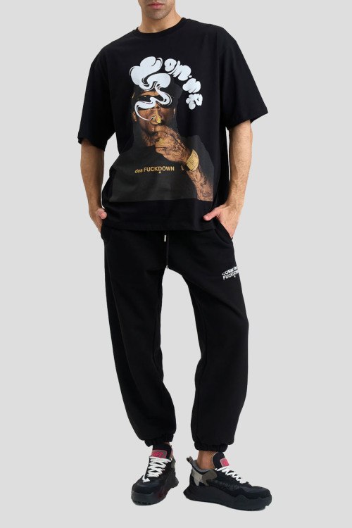 Детали: Мужская черная хлопковая футболка от Comme des Fuckdown (Камм дес Факдаун). Принт на груди, круглый вырез горловины, короткий рукав, классическая длина