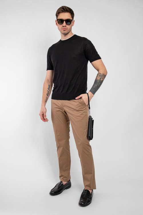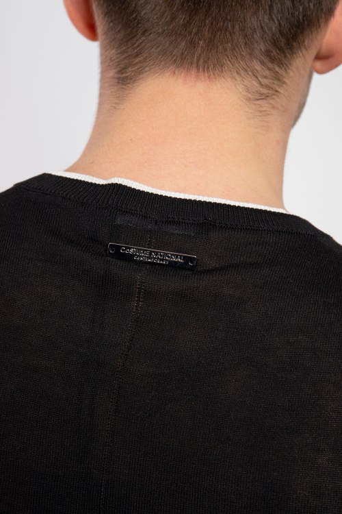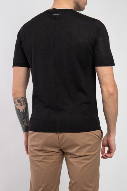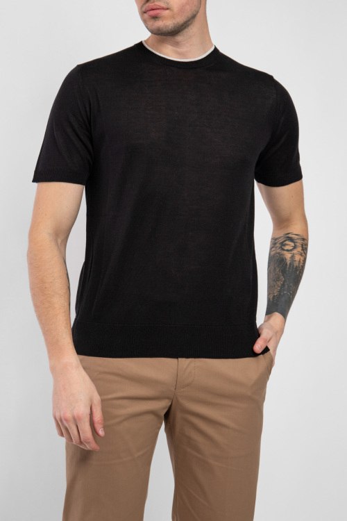 Мужская черная футболка из шелка от Costume National (Костюм Националь). Классическая длина, круглый вырез с контрастной окантовкой, короткие рукава, металлическая нашивка с логотипом бренда.