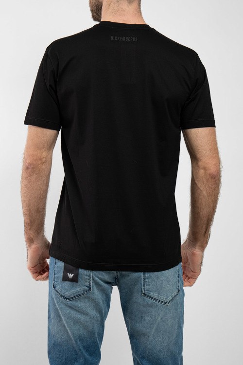 Мужская черная футболка из хлопка от Bikkembergs (Биккембергс). Классическая длина, круглый вырез горловины, короткие рукава, брендированный принт.