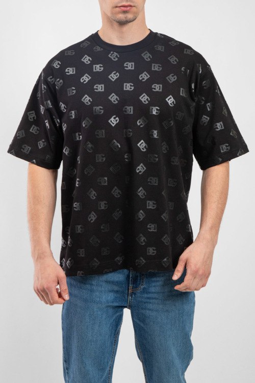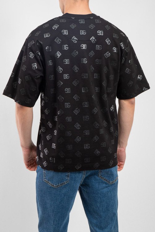 Мужская черная футболка из хлопка от Dolce & Gabbana (Дольче энд Габбана). Классическая длина, круглый вырез горловины, короткие рукава, дизайн с монограммой по всей поверхности изделия.