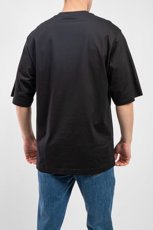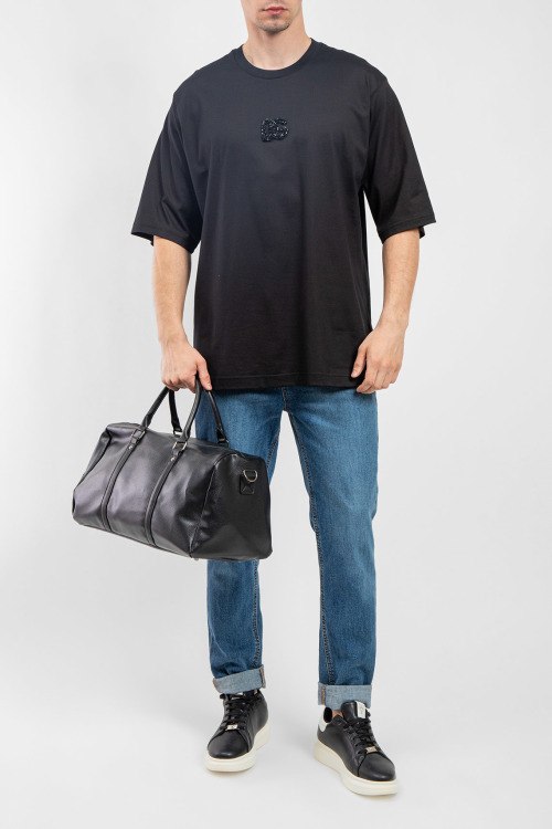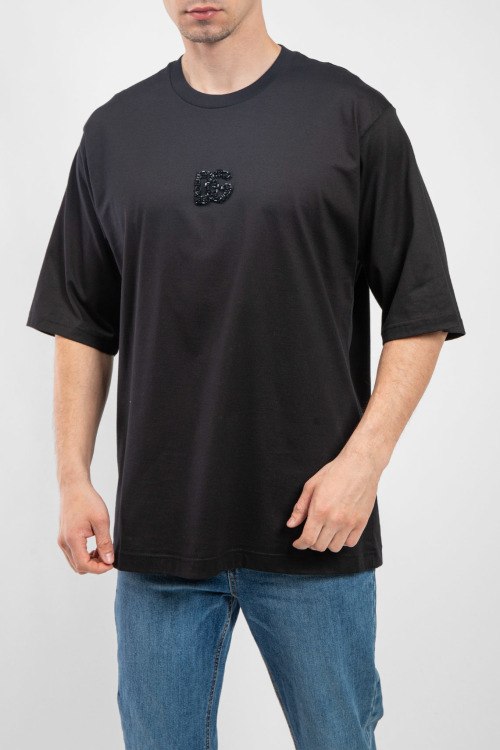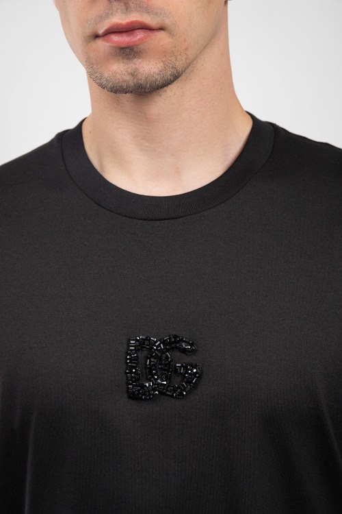 Мужская черная футболка из хлопка от Dolce & Gabbana (Дольче энд Габбана). Классическая длина, круглый вырез горловины, короткие рукава, аппликация из бисера в виде логотипа бренда.