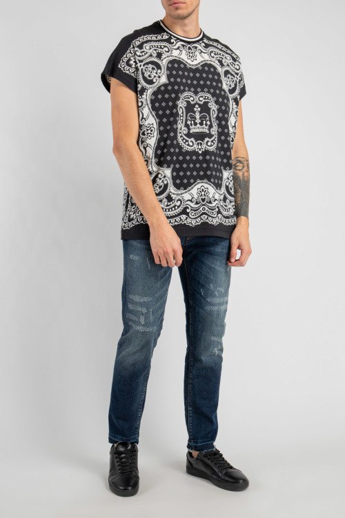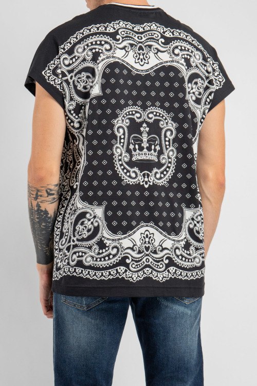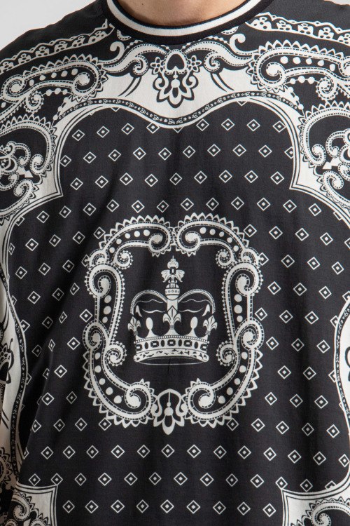 Детали: Мужская черная футболка из хлопка от Dolce & Gabbana (Дольче энд Габбана). Классическая длина, круглый вырез горловины, модель с цельнокроеным рукавом, принт по всей поверхности изделия