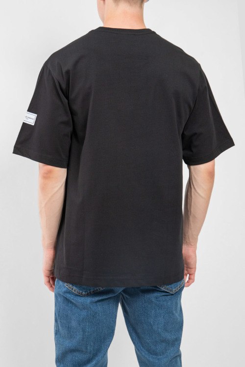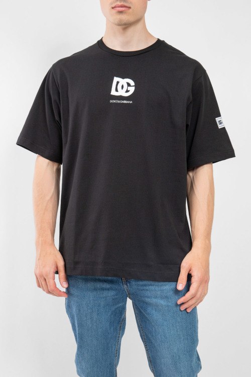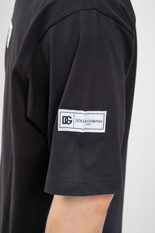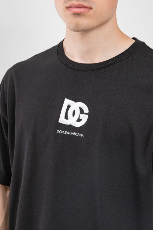 Мужская черная хлопковая футболка от Dolce & Gabbana (Дольче энд Габбана). Модель оверсайз, вышитый логотип на груди, круглый вырез горловины, короткий рукав с нашивкой логотипа, классическая длина.