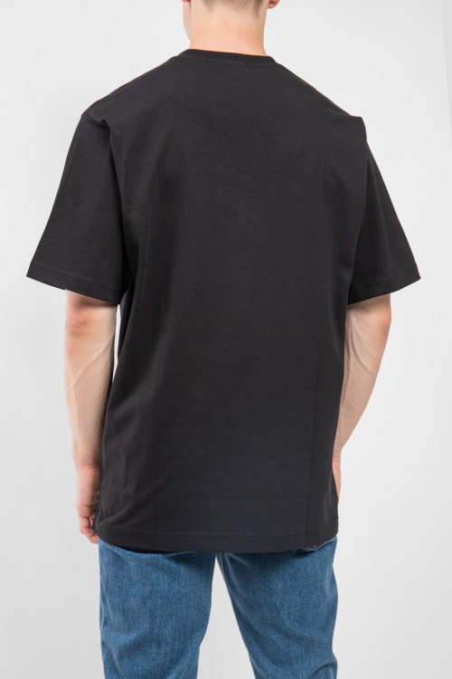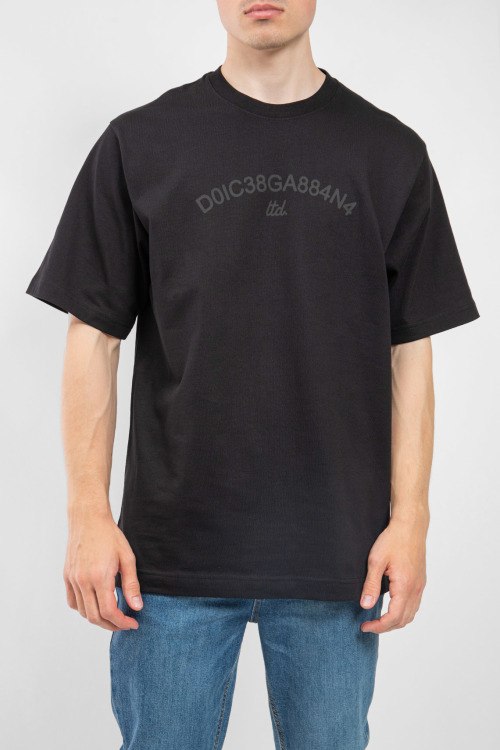 Мужская черная хлопковая футболка от Dolce & Gabbana (Дольче энд Габбана). Модель оверсайз, принт с логотипом на груди, круглый вырез горловины, короткий рукав, классическая длина.