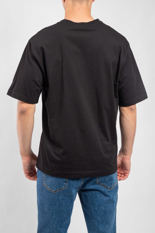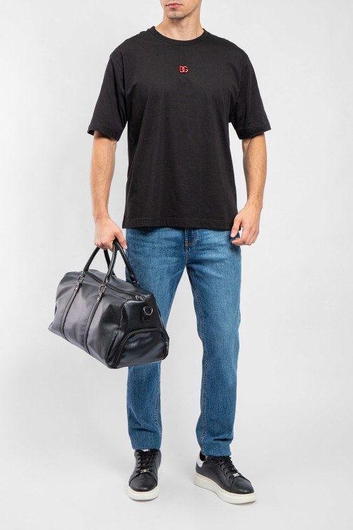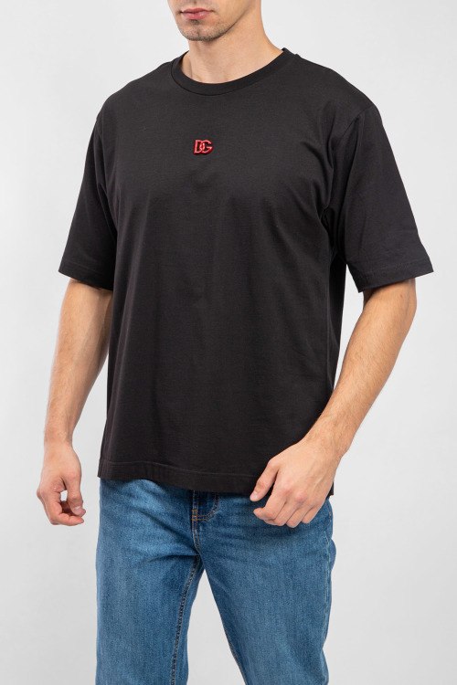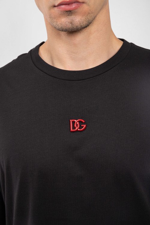 Мужская черная хлопковая футболка от Dolce & Gabbana (Дольче энд Габбана). Значок с логотипом на груди, круглый вырез горловины, короткий рукав, классическая длина.
