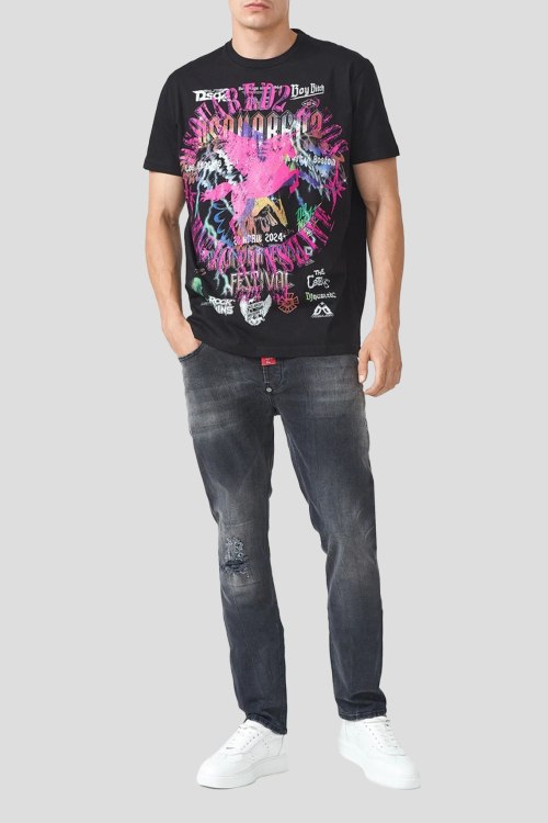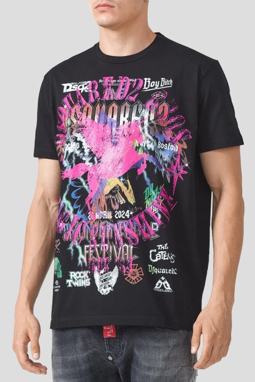 Детали: Мужская черная хлопковая футболка от Dsquared2 (Дискваред). Принт на груди, круглый вырез горловины, короткий рукав, классическая длина