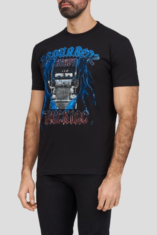 Детали: Мужская черная хлопковая футболка от Dsquared2 (Дискваред). Принт на груди, круглый вырез горловины, короткий рукав, классическая длина
