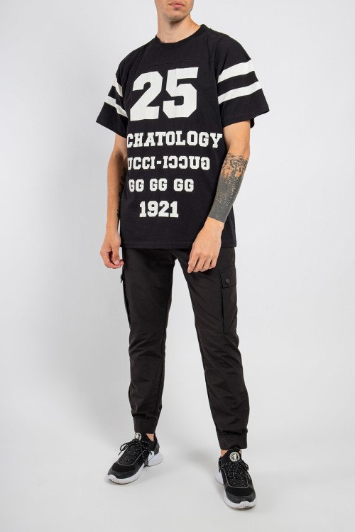Детали: Мужская черная футбола из хлопка от Gucci (Гуччи). Классическая длина, круглый вырез горловины, короткие рукава, декорирована принтом с логотипом бренда