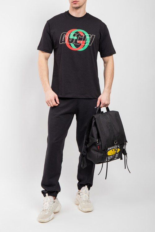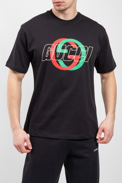 Мужская черная хлопковая футболка от Gucci (Гуччи). Логотип Double G на груди, круглый вырез горловины, короткий рукав, классическая длина.