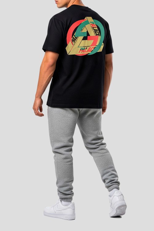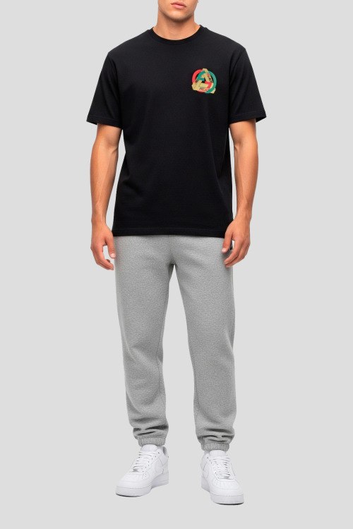 Хлопковая футболка черного цвета, прямой силуэт, короткий рукав, круглый вырез горловины, спереди украшены принтом с фирменным логотипом бренда