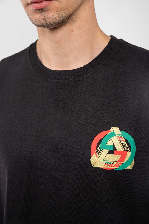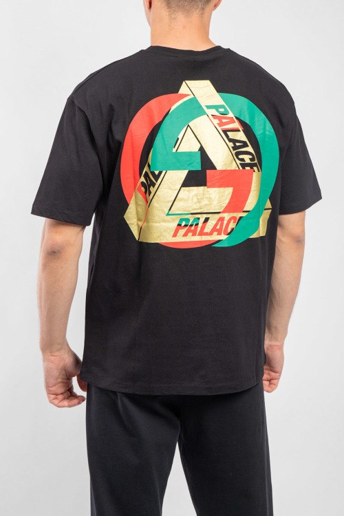 Мужская черная хлопковая футболка Gucci x Palace от Gucci (Гуччи). Принт на груди и на спине, круглый вырез горловины, короткий рукав, классическая длина.