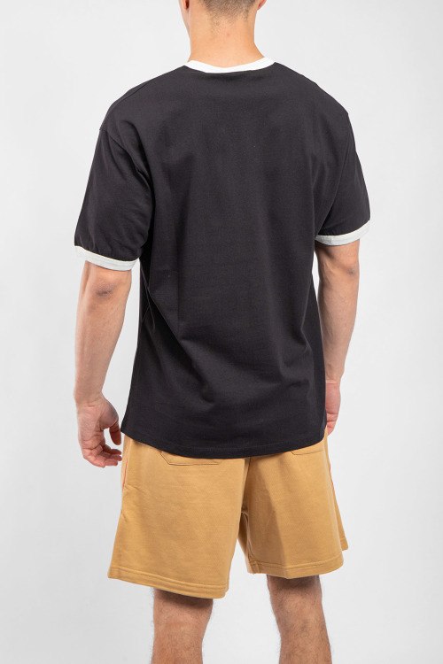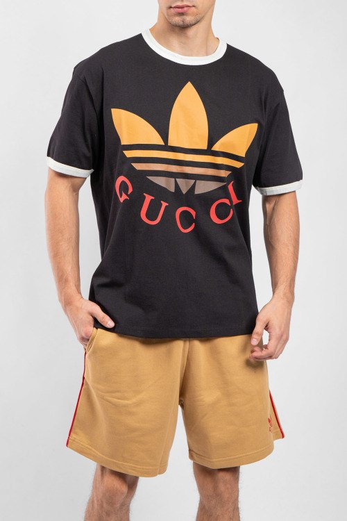 Мужская черная хлопковая футболка Gucci х Adidas от Gucci (Гуччи). Логотип на груди, круглый вырез горловины, короткий рукав, классическая длина.