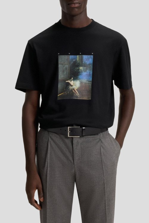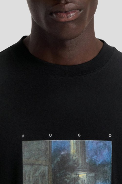 Детали: Мужская черная хлопковая футболка Dabolos из коллекции HUGO x apoh от Hugo by Hugo Boss (Хуго бай Хуго Босс). Принт на груди, круглый вырез горловины, короткий рукав, классическая длина