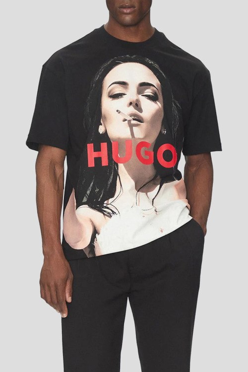 Мужская черная хлопковая футболка Duwedie от Hugo by Hugo Boss (Хуго бай Хуго Босс). Принт на груди, круглый вырез горловины, короткий рукав, классическая длина.