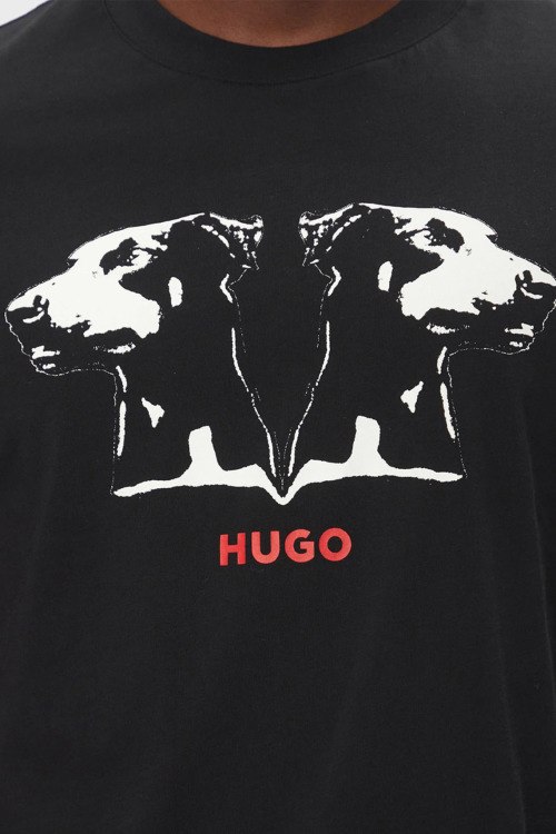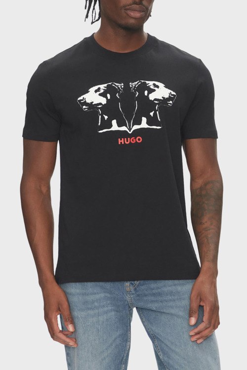 Детали: Мужская черная хлопковая футболка Dobero от Hugo by Hugo Boss (Хуго бай Хуго Босс). Принт на груди, круглый вырез горловины, короткий рукав, классическая длина