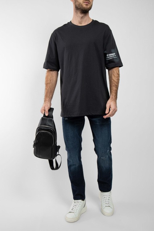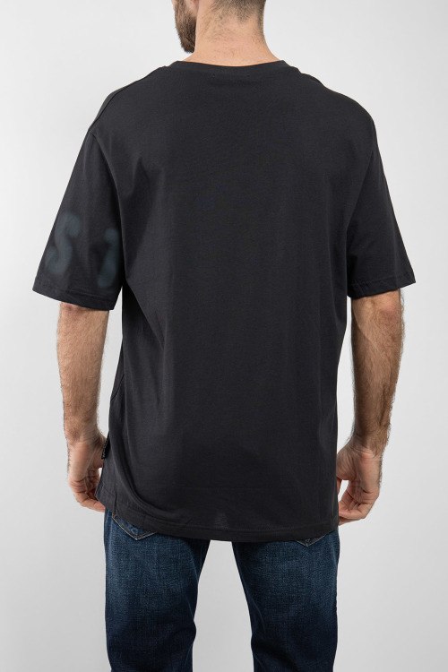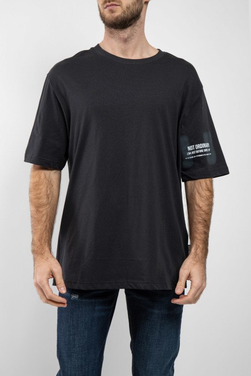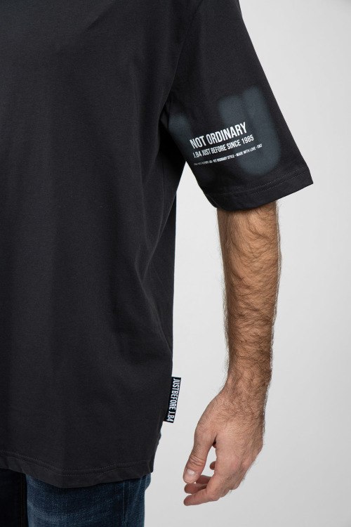 Мужская черная футболка из хлопка от J.B4 Just Before (Джаст Бифо). Круглый вырез горловины, короткие рукава, классическая длина, принт с логотипом бренда.