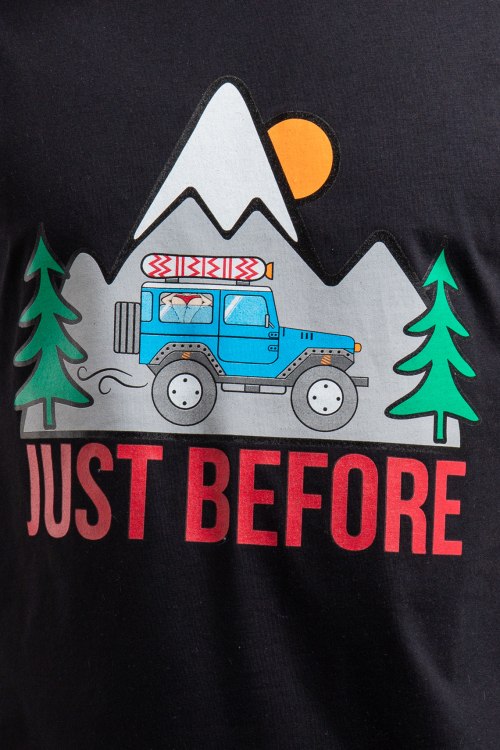 Мужская черная футболка из натурального хлопка от J.B4 Just Before (Джаст Бифо). Свободный крой, круглый вырез под горло, короткие рукава. Декорирована спереди ярким принтом с брендовой надписью.
