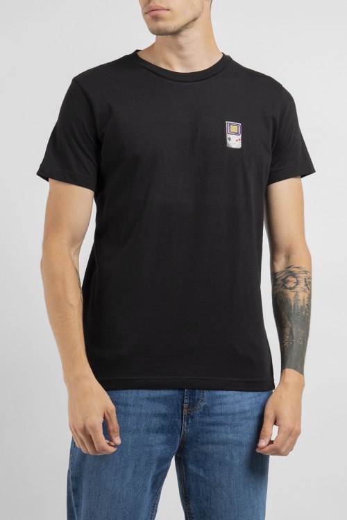 Мужская черная футболка из хлопка от Ko Samui (Ко Самуи). Классическая длина, спереди вышивка Game boy, круглый вырез горловины, короткие рукава.