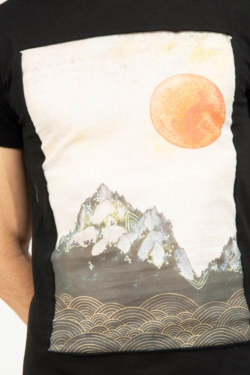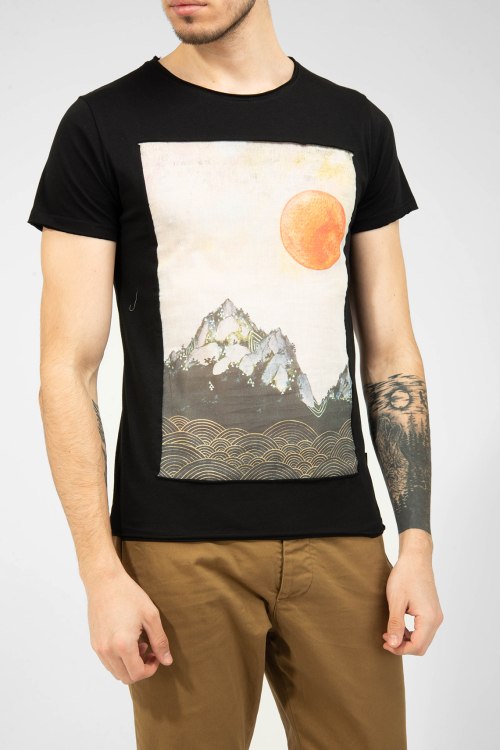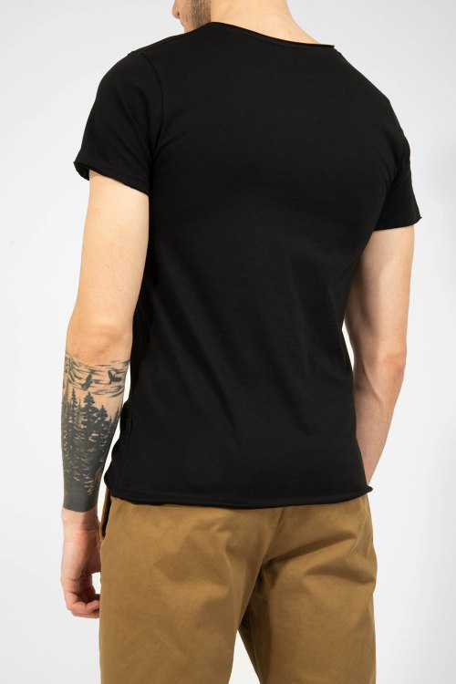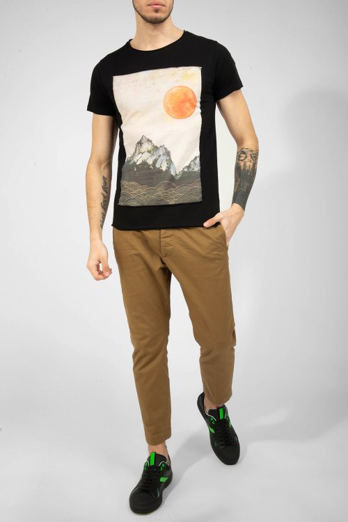 Футболка черного цвета из натурального хлопка. Однотонная футболка прямого силуэта, короткий рукав, круглый вырез горловины, спереди украшена принтом.