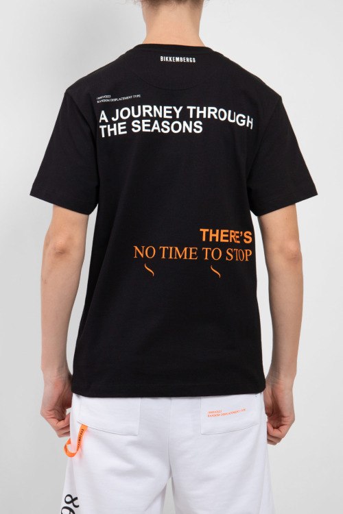Мужская черная футболка из хлопкового микса от Bikkembergs (Биккембергс). Классическая длина, круглый вырез горловины, короткие рукава, модель декорирована ярким принтом в виде надписей.
