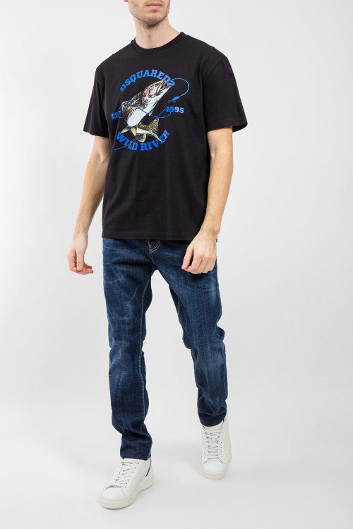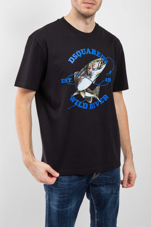 Мужская черная футболка из хлопка от Dsquared2 (Дискваред). Классическая длина, круглый вырез горловины, короткие рукава, графический принт спереди.