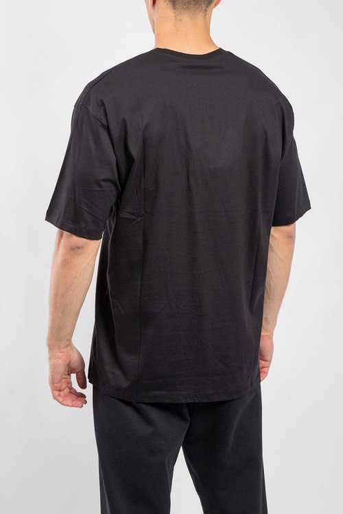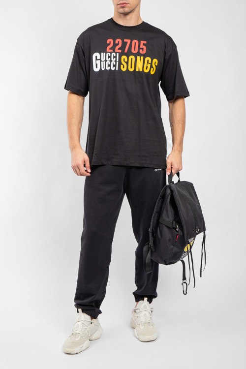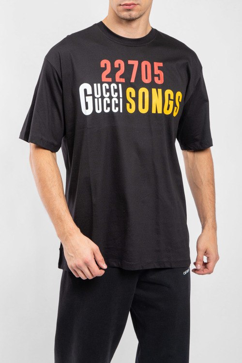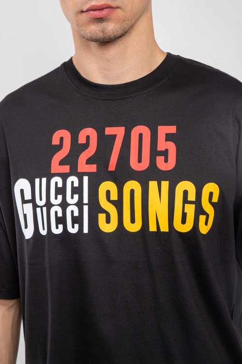 Мужская черная футболка из хлопкового микса от Gucci (Гуччи). Классическая длина, круглый вырез горловины, короткие рукава, брендированный принт.