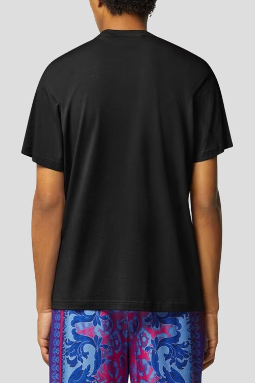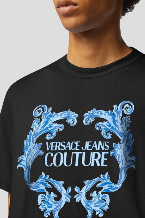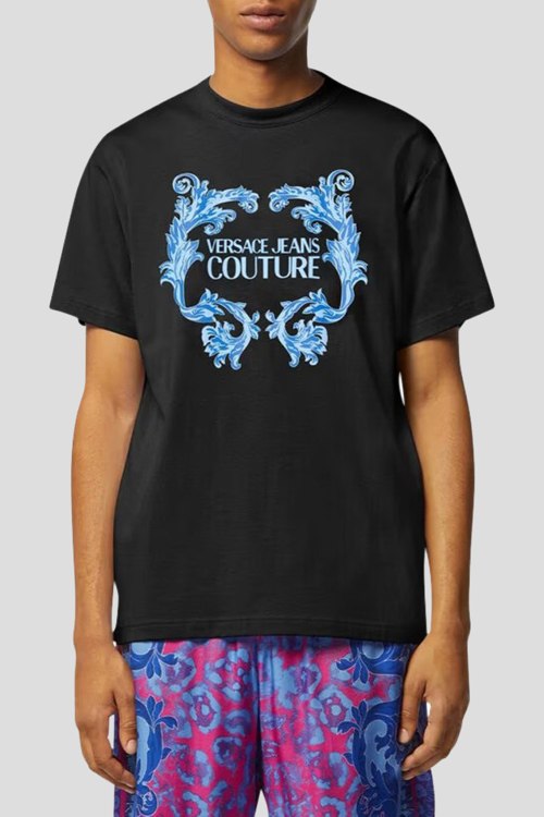 Мужская черная футболка из хлопка от Versace Jeans Couture (Версаче Джинс Кутюр). Классическая длина, круглый вырез горловины. короткие рукава, спереди принт с логотипом бренда