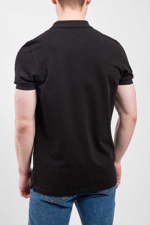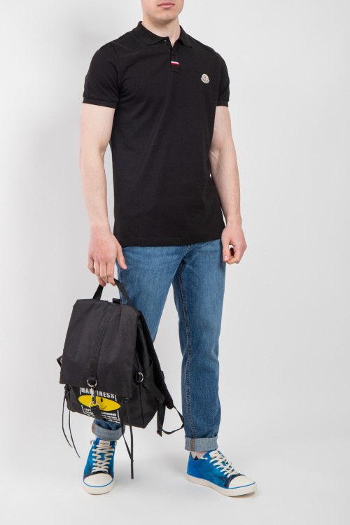 Мужская черная футболка из хлопка от Moncler (Монклер). Классический воротник, горловина на пуговицах, короткие рукава, патч-лого на груди, по бокам разрезы.