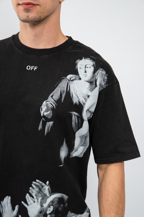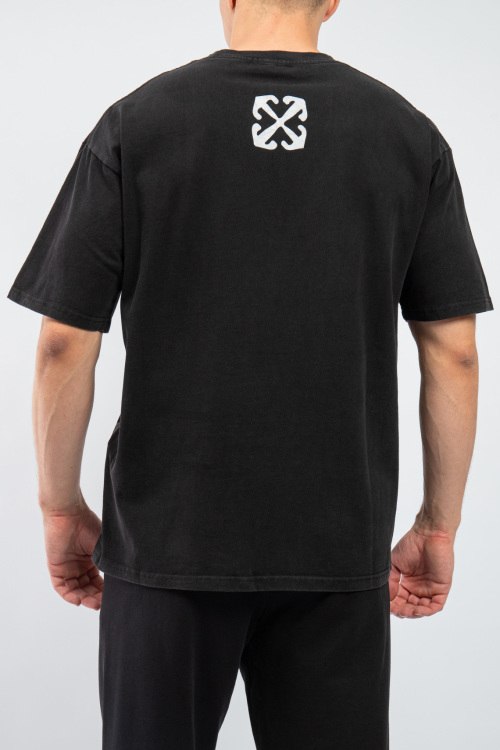 Мужская черная хлопковая футболка от Off-White (Офф-Вайт). Графический принт, круглый вырез горловины, короткий рукав, классическая длина.