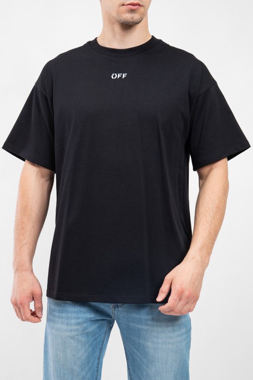 Мужская черная хлопковая футболка от Off-White (Офф-Вайт). Принт с логотипом на груди и на спине, круглый вырез горловины, короткий рукав, классическая длина.