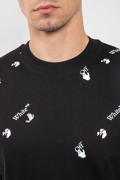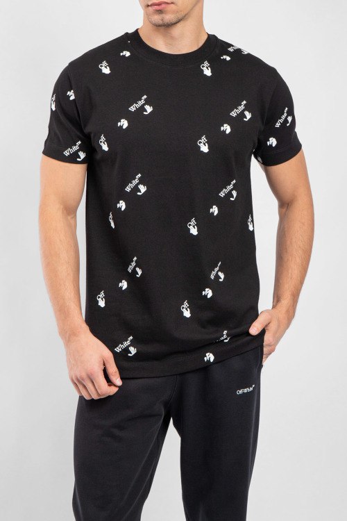 Мужская черная хлопковая футболка от Off-White (Офф-Вайт). Принт с логотипом по всей поверхности, круглый вырез горловины, короткий рукав, классическая длина.