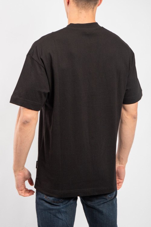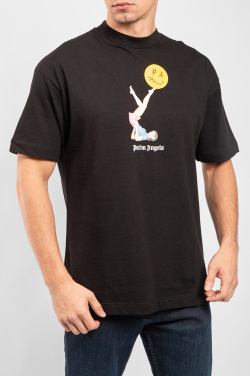 Мужская черная хлопковая футболка от Palm Angels (Палм Энджелс). Принт пин-ап на груди, круглый вырез горловины, короткий рукав, классическая длина.