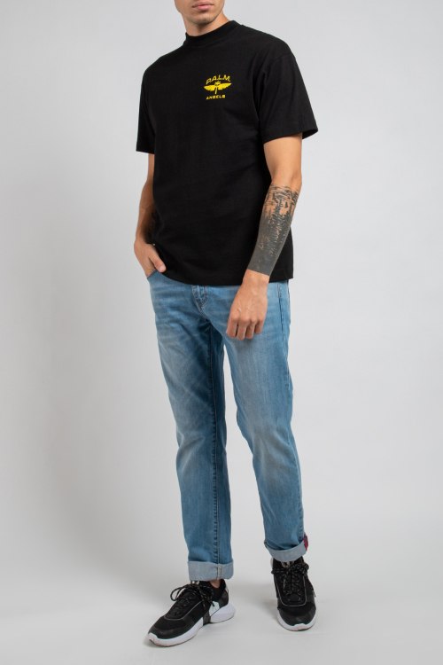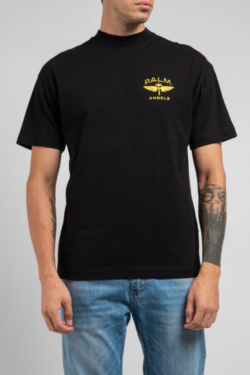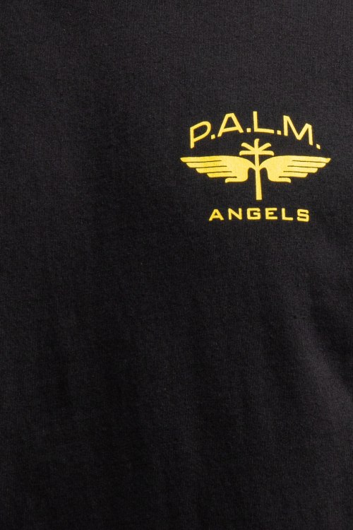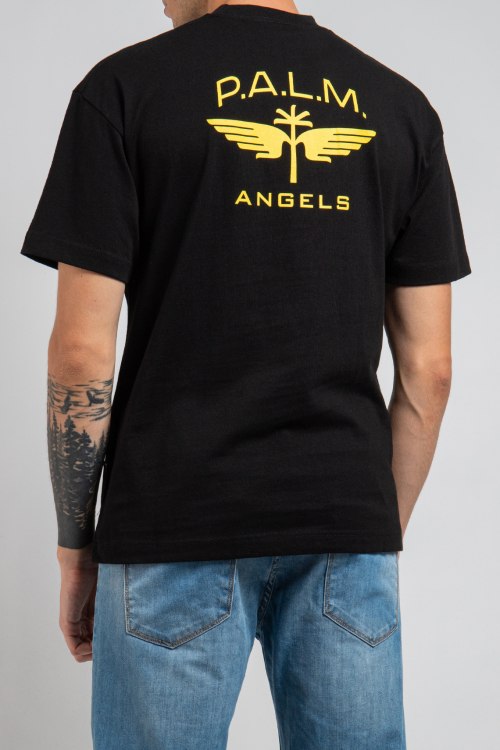 Мужская черная хлопковая футболка от Palm Angels (Палм Энджелс). Двухсторонний принт с логотипом, круглый вырез горловины, короткий рукав