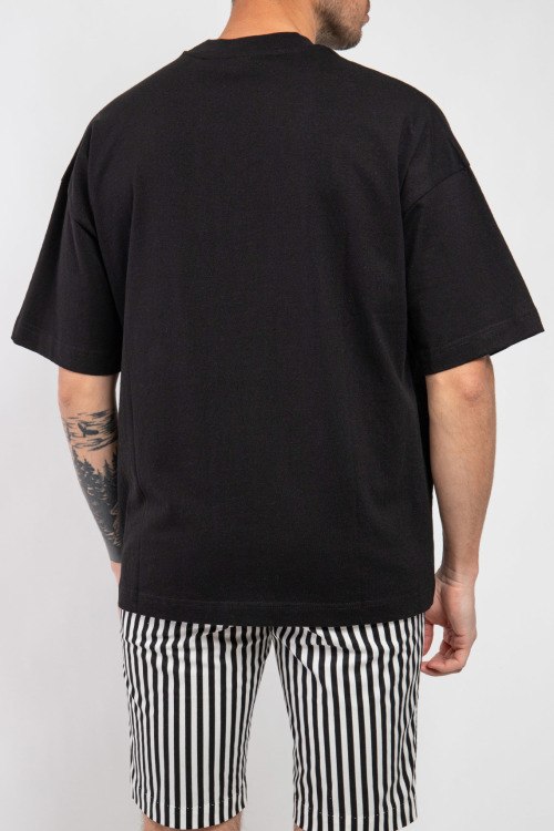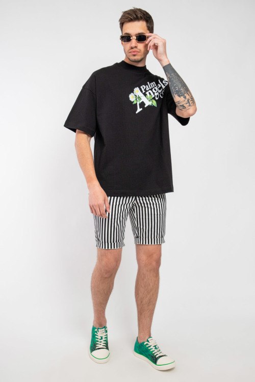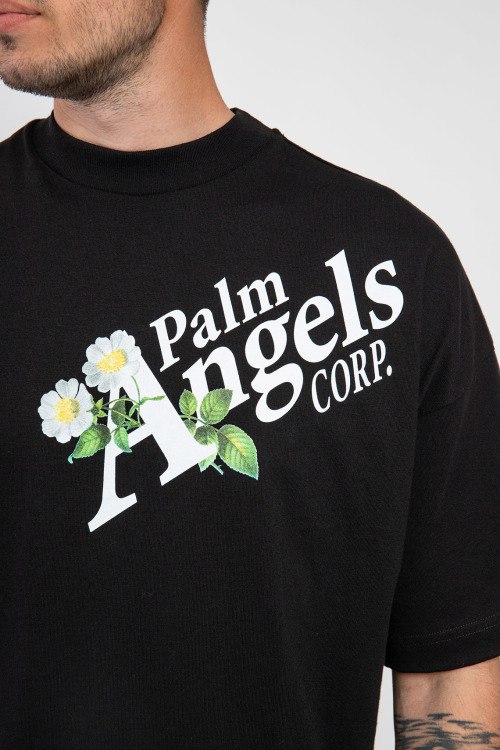 Мужская черная футболка из хлопка от Palm Angels (Палм Энджелс). Классическая длина, круглый вырез горловины, короткие рукава, декорирована принтом Daisy с логотипом бренда
