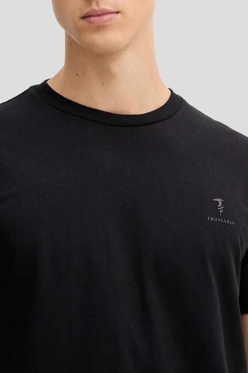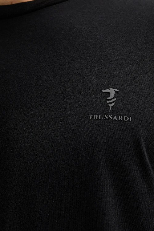 Детали: Мужская черная хлопковая футболка от Trussardi (Труссарди). Логотип на груди, круглый вырез горловины, короткий рукав, классическая длина
