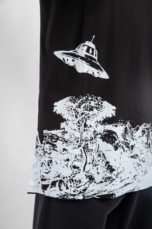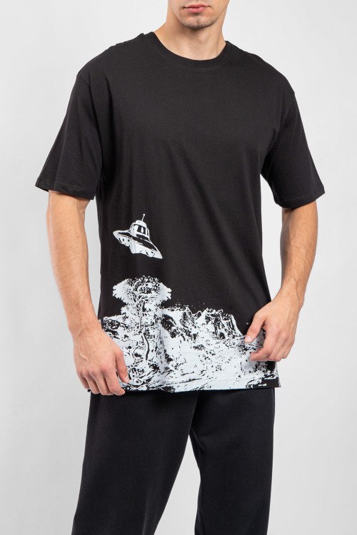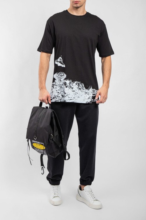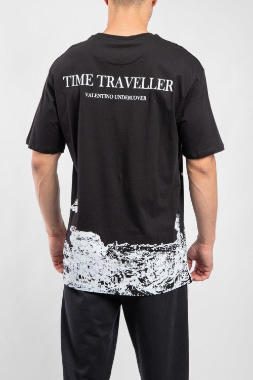 Мужская черная хлопковая футболка X Undercover Time Traveller от Valentino (Валентино). Графический принт спереди и сзади, круглый вырез горловины, короткий рукав, классическая длина.